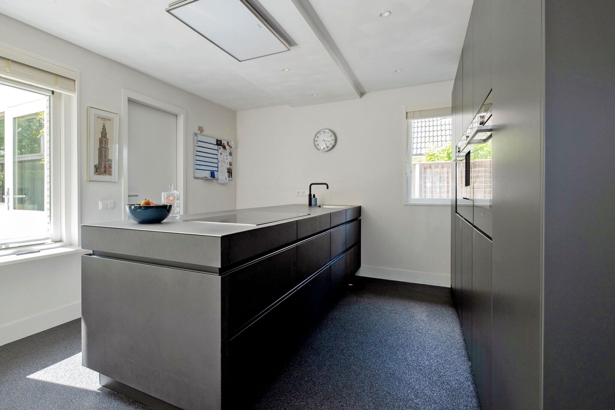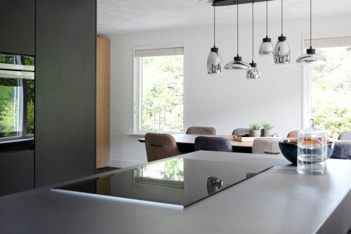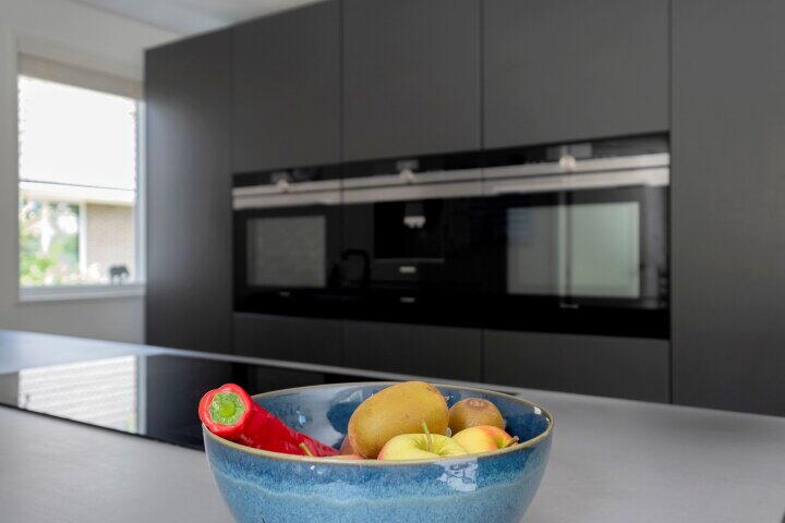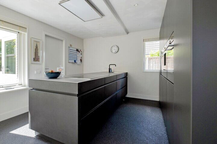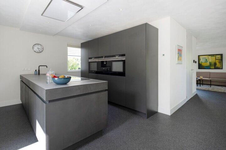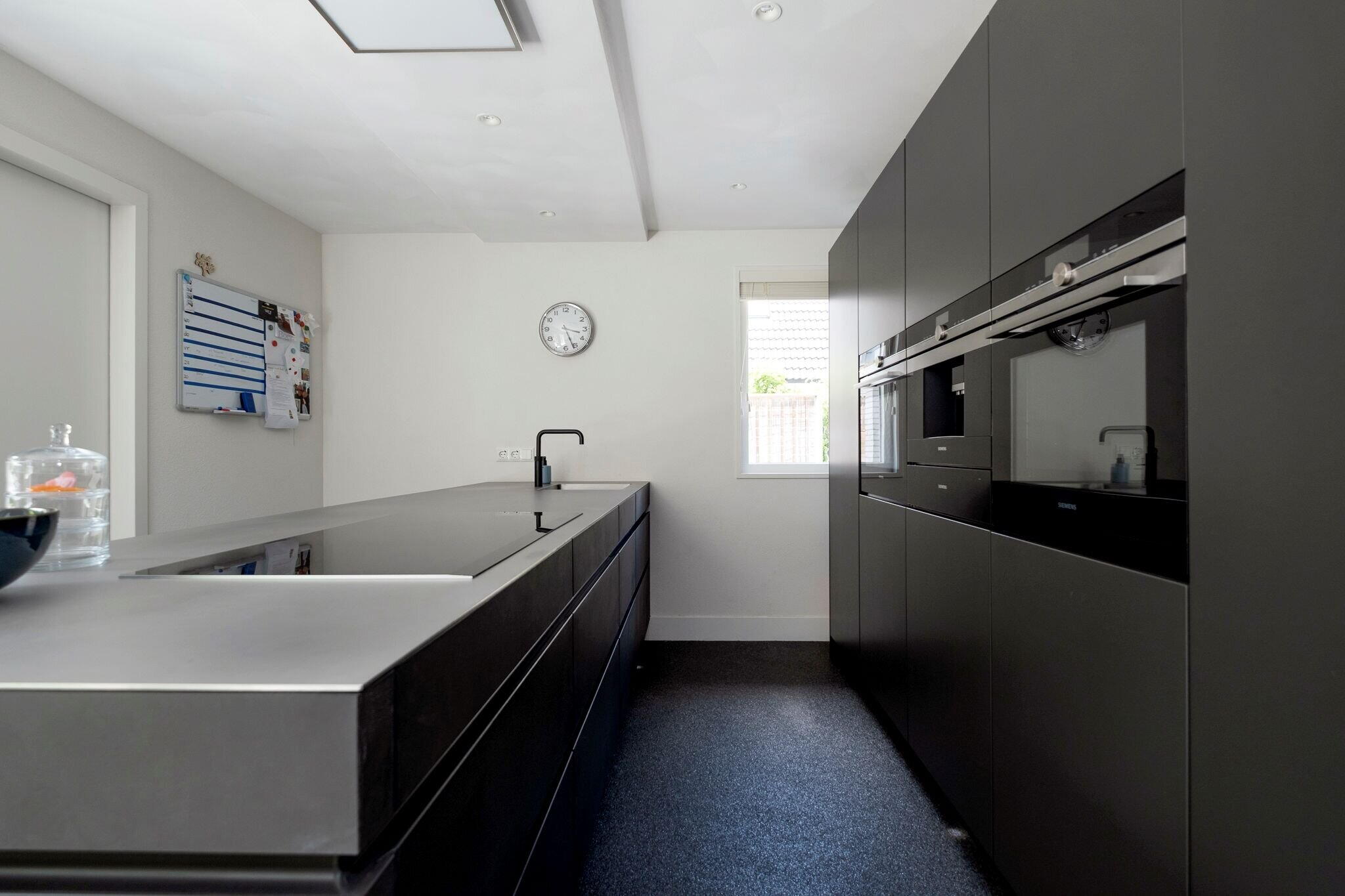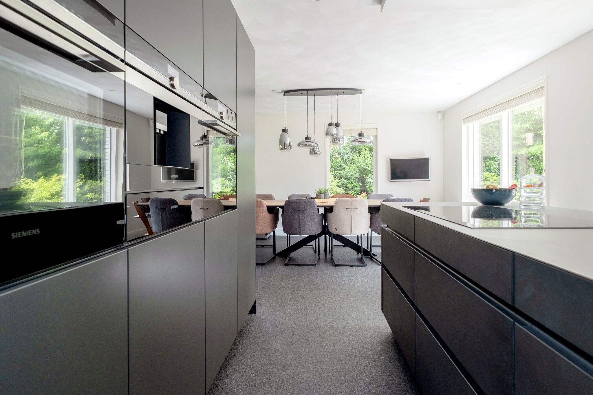 Moderne open keuken (ca. 12m2) voorzien van een ruime 5-pits inductie kookplaat, afzuigkap, koffiemachine, grote koelkast, stoomoven, combi stoomoven, serviesverwarmer en vaatwasser (allen van het merk Siemens). Keuken geheel vernieuwd in 2018;