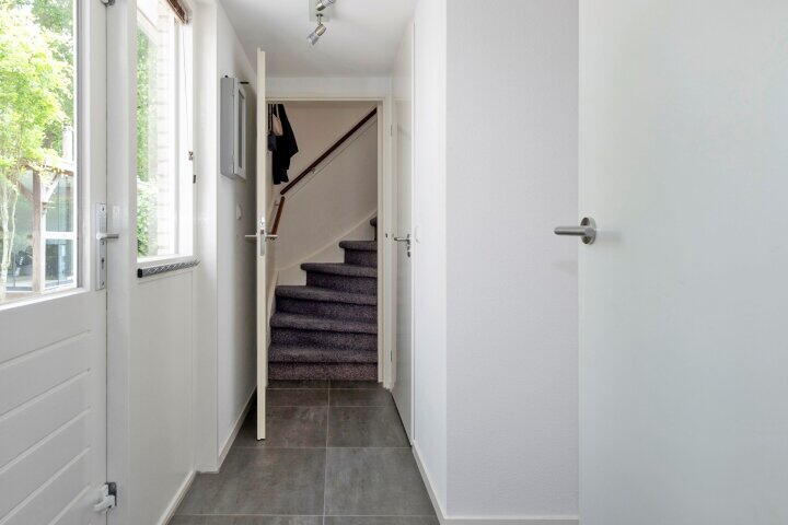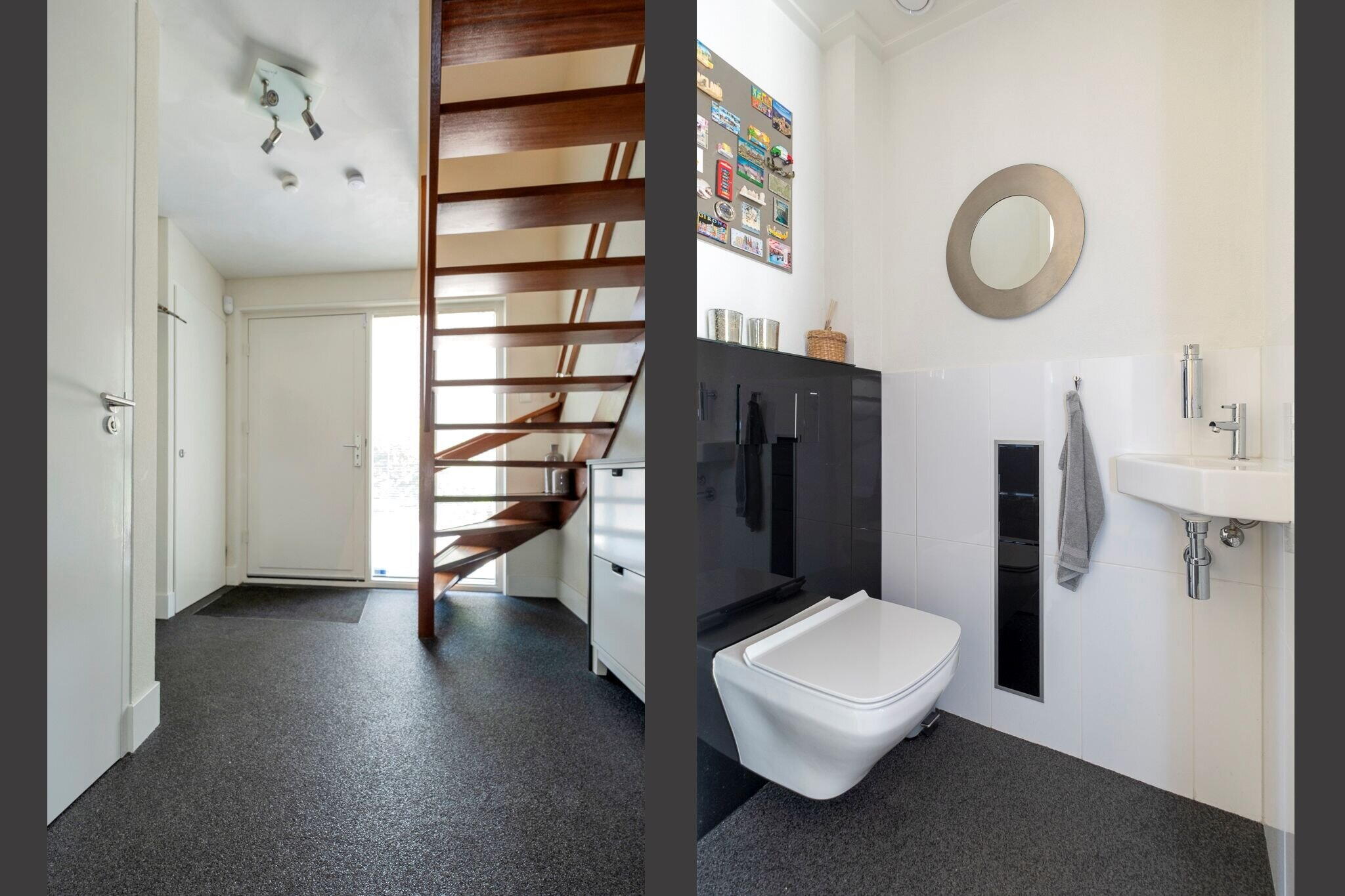 Entree/hal met trapopgang, meterkast en modern toilet met fonteintje;