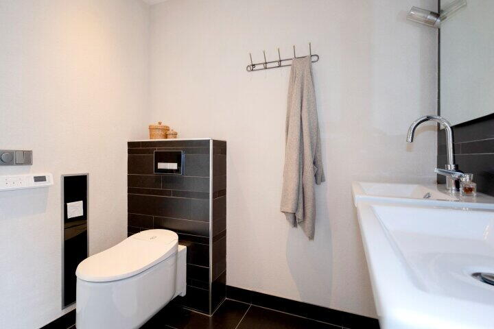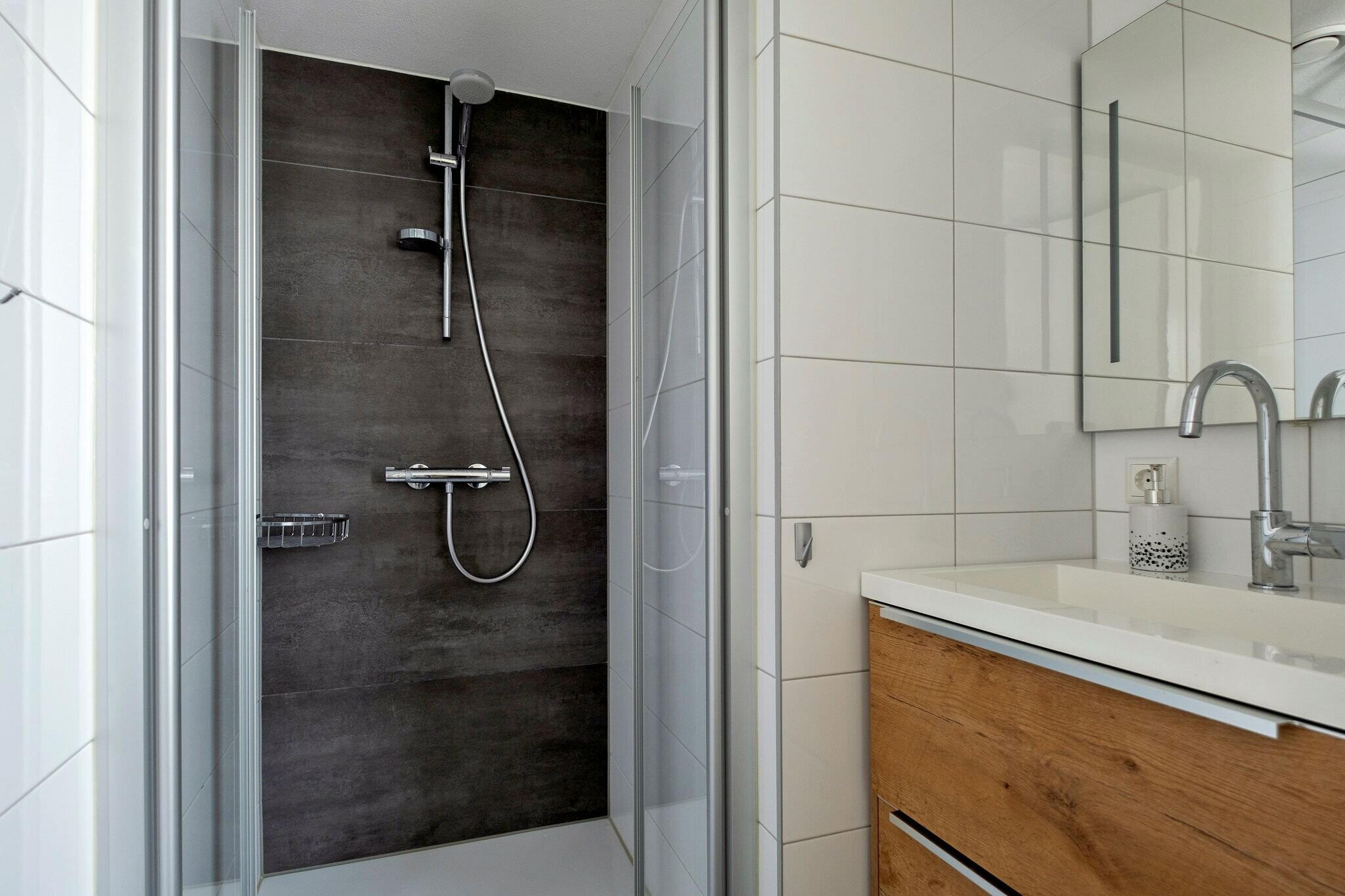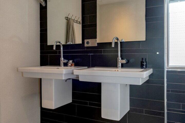 - Douche, wastafel, wastafelmeubel, dubbele wastafel, inloopdouche, toilet, en vloerverwarming