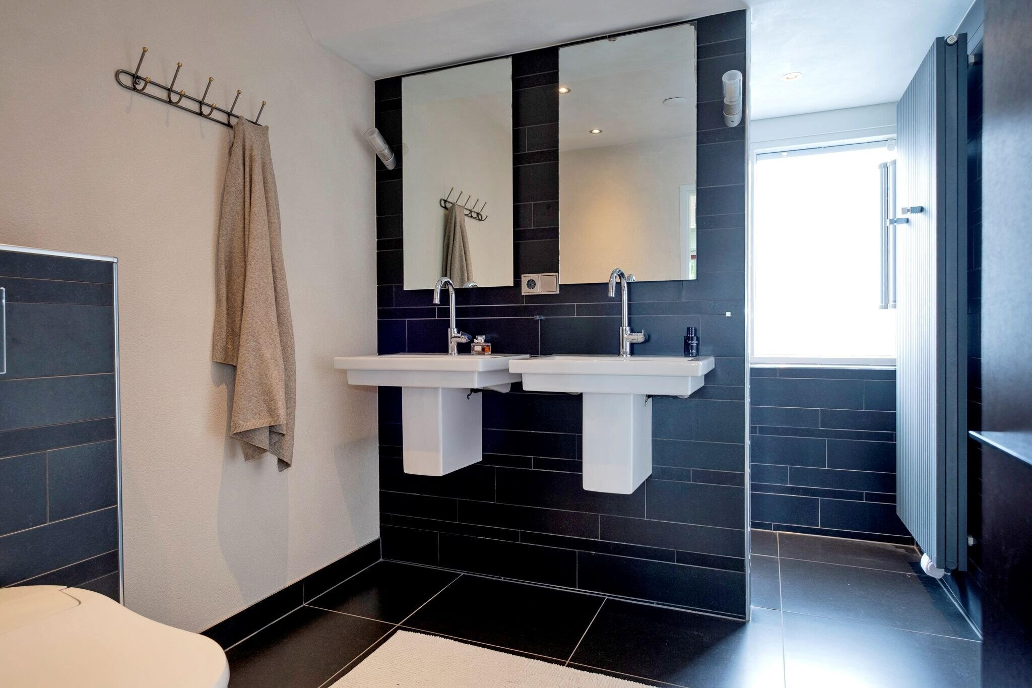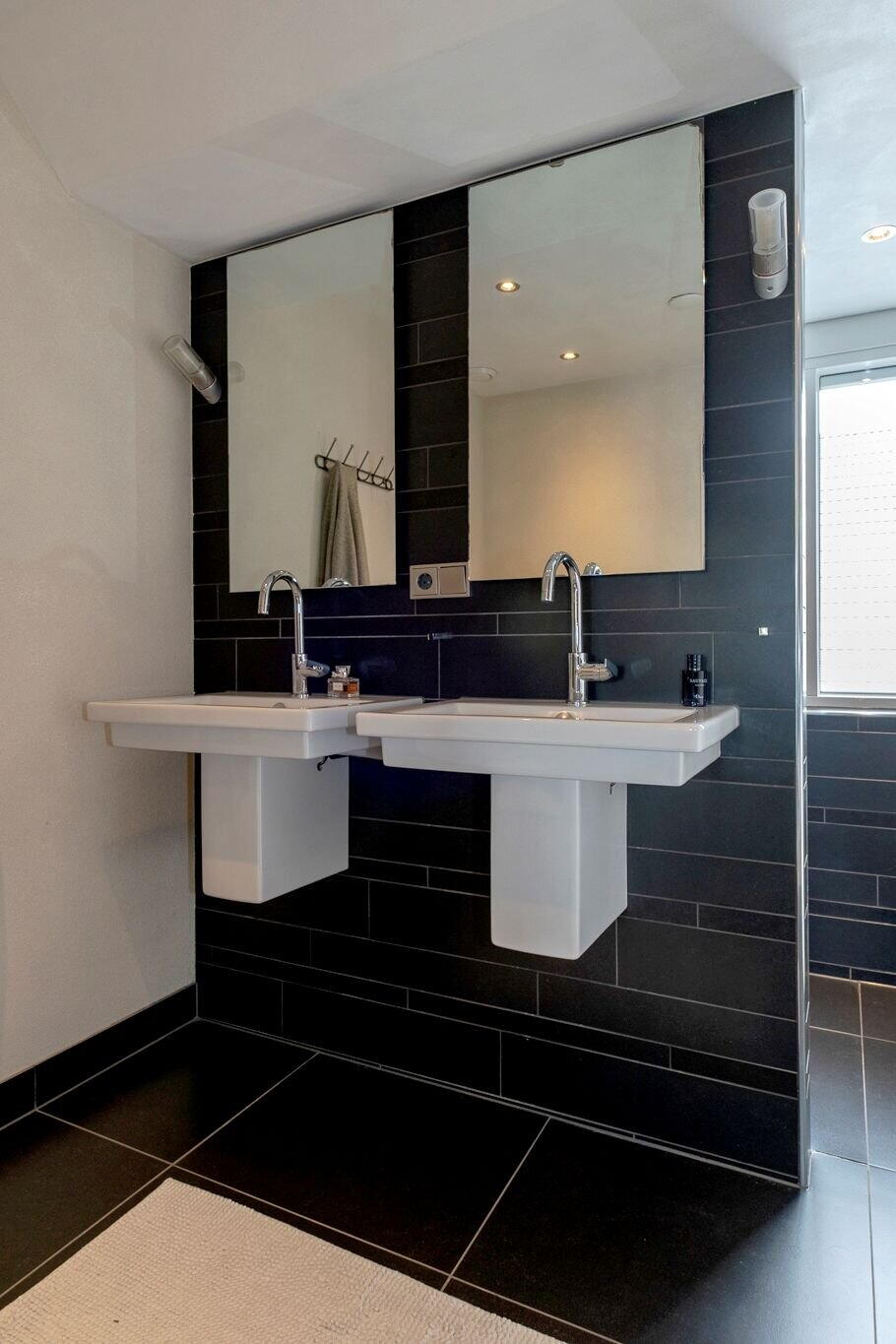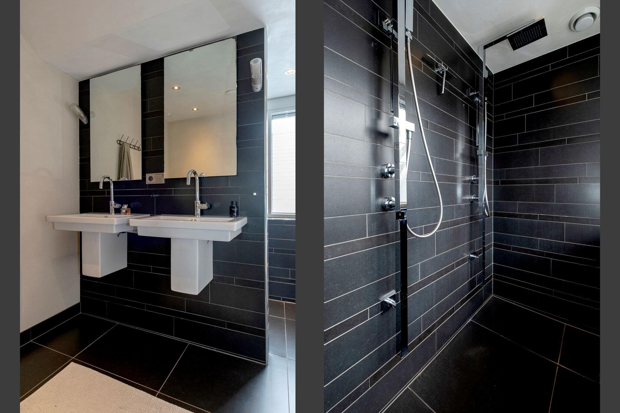 Moderne badkamer (ca. 7m2) met dubbele douche, dubbele wastafel incl. wasmeubel en modern toilet;