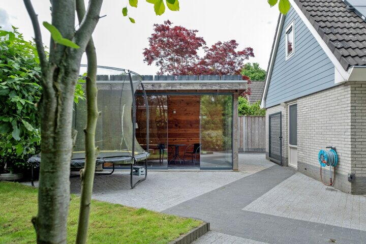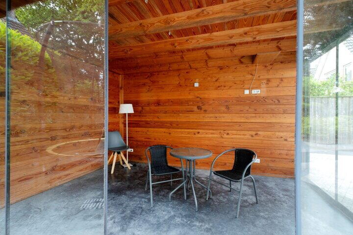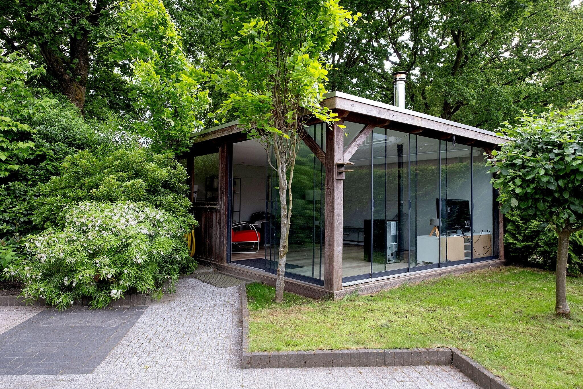 Houten tuinhuis voorzien van glazen schuifpanelen en pelletkachel (ter overname);