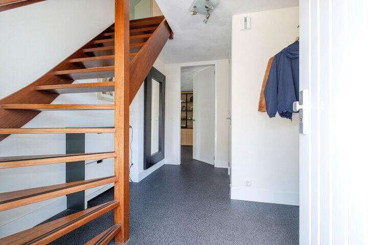 Trap naar eerste verdieping grote slaapkamer (ca. 16m2) met wastafel en veel opbergruimte;